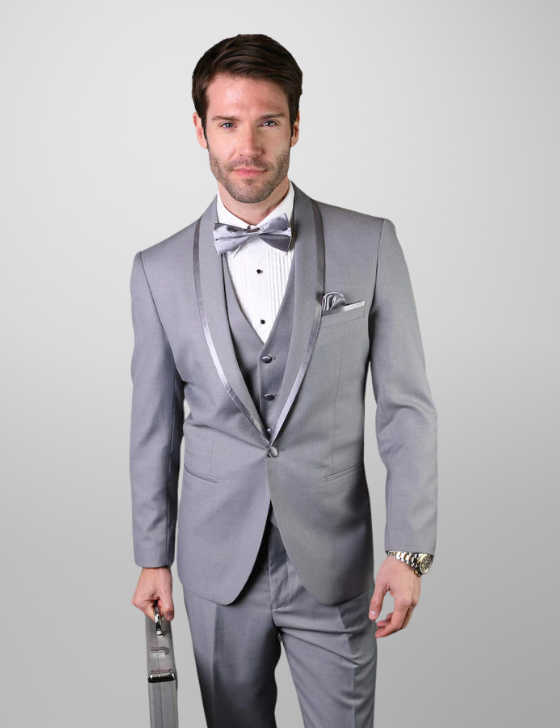 Men’s Gray solid 3pc suit modern fit wide‑leg pants double‑breasted vest super 180’s italian wool STATEMENT SUITS FLORENCE