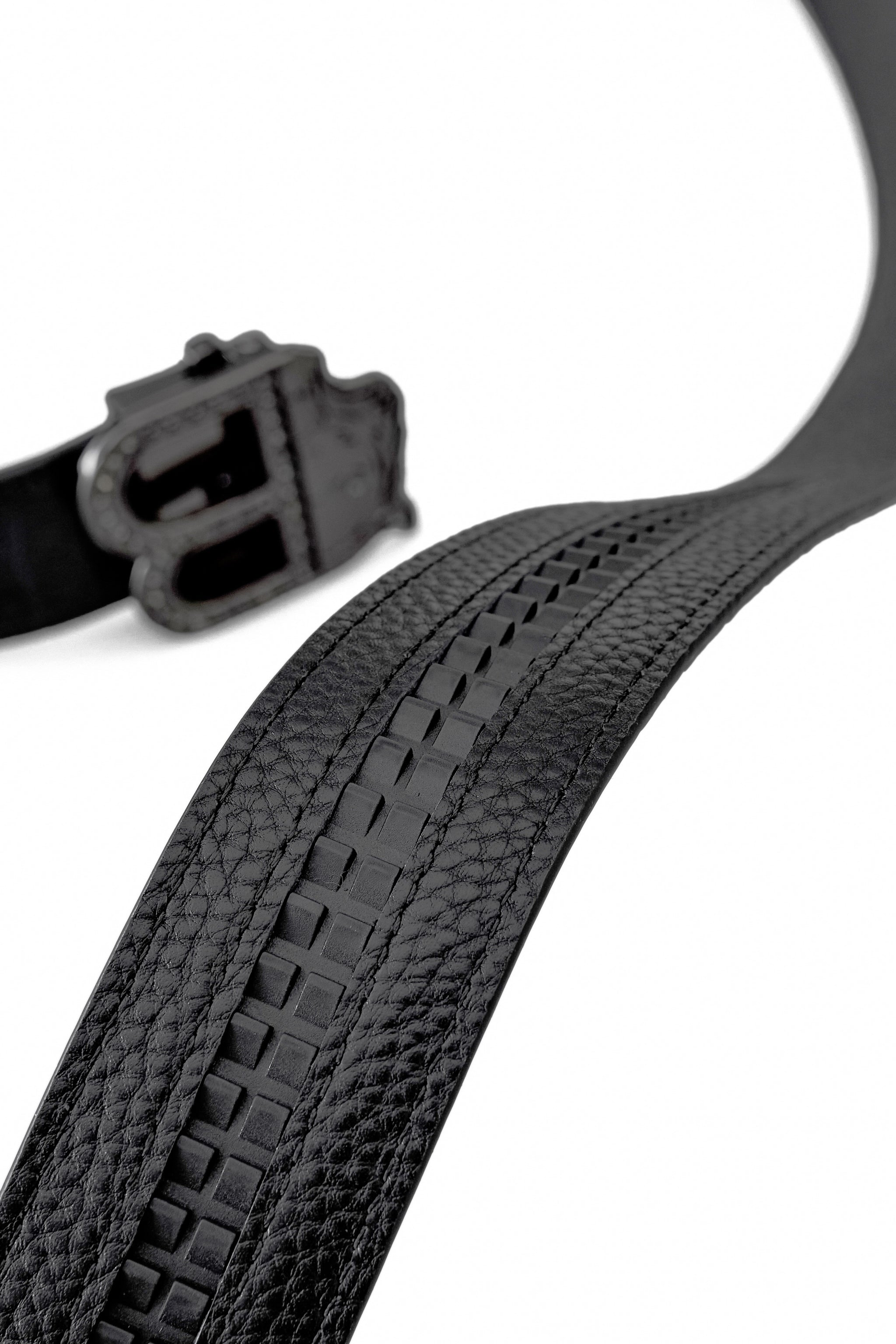 Boldly modern with a touch of edge, this belt pairs croc-embossed leather with a blackout automatic buckle detailed in tonal studs. The seamless mechanism ensures effortless wear, while the sleek all-black palette delivers statement refinement for both tailored and casual looks.