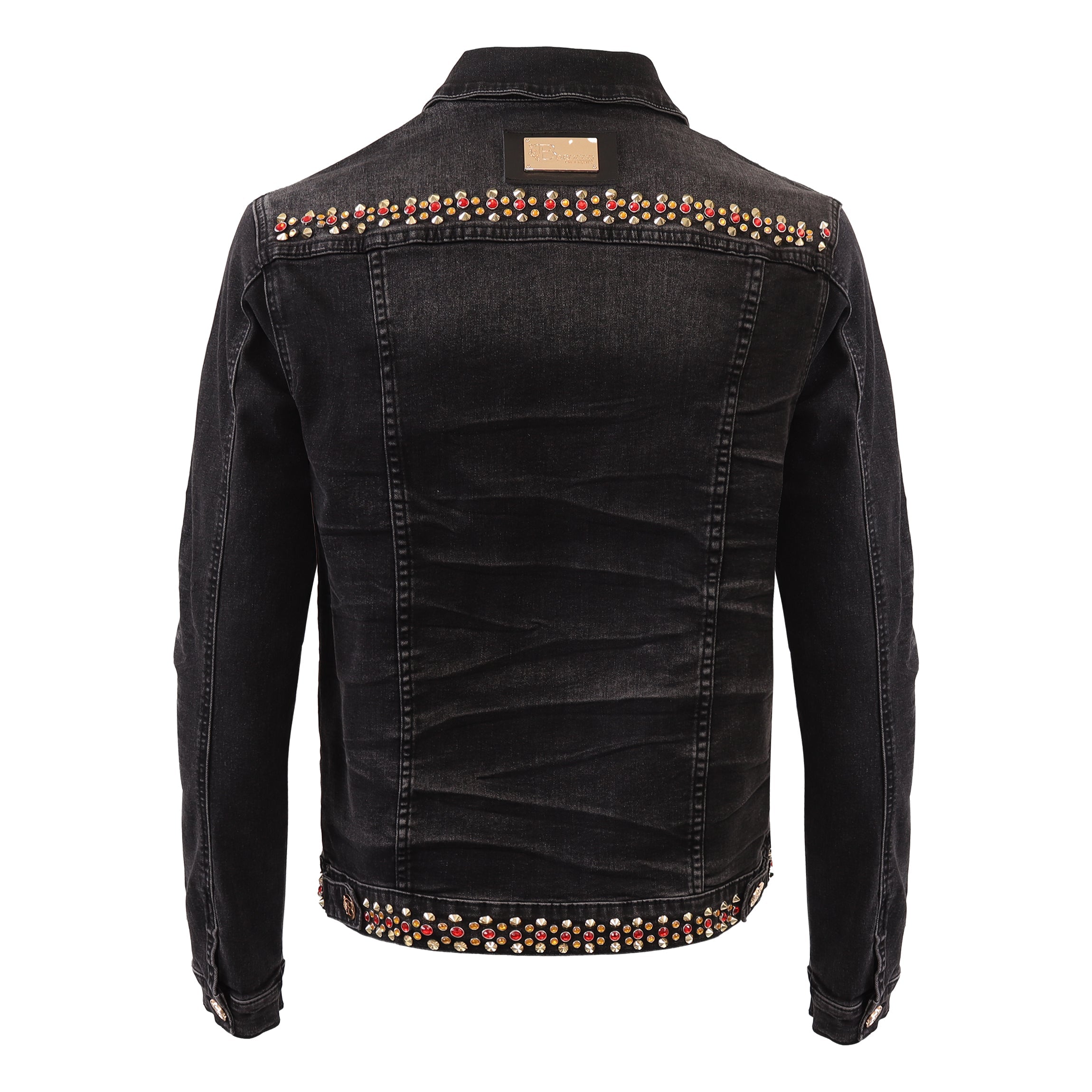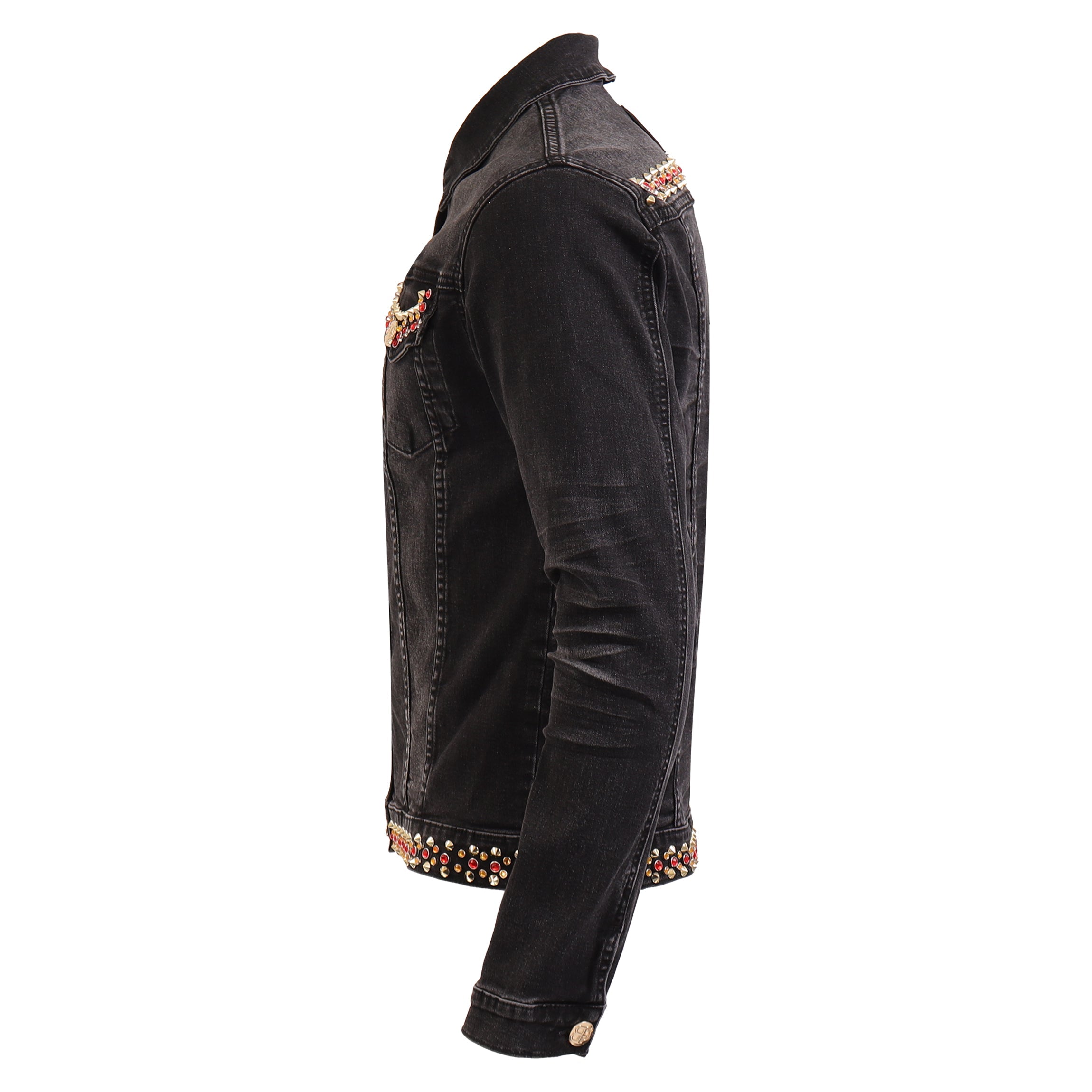 Turn heads with the Stitch And Sparkle denim jacket by Barocco—a bold blend of classic craftsmanship and standout embellishment. Designed for those who dress to impress, this jacket features shimmering jewel-toned studs and custom gold buttons that elevate its timeless black denim silhouette.