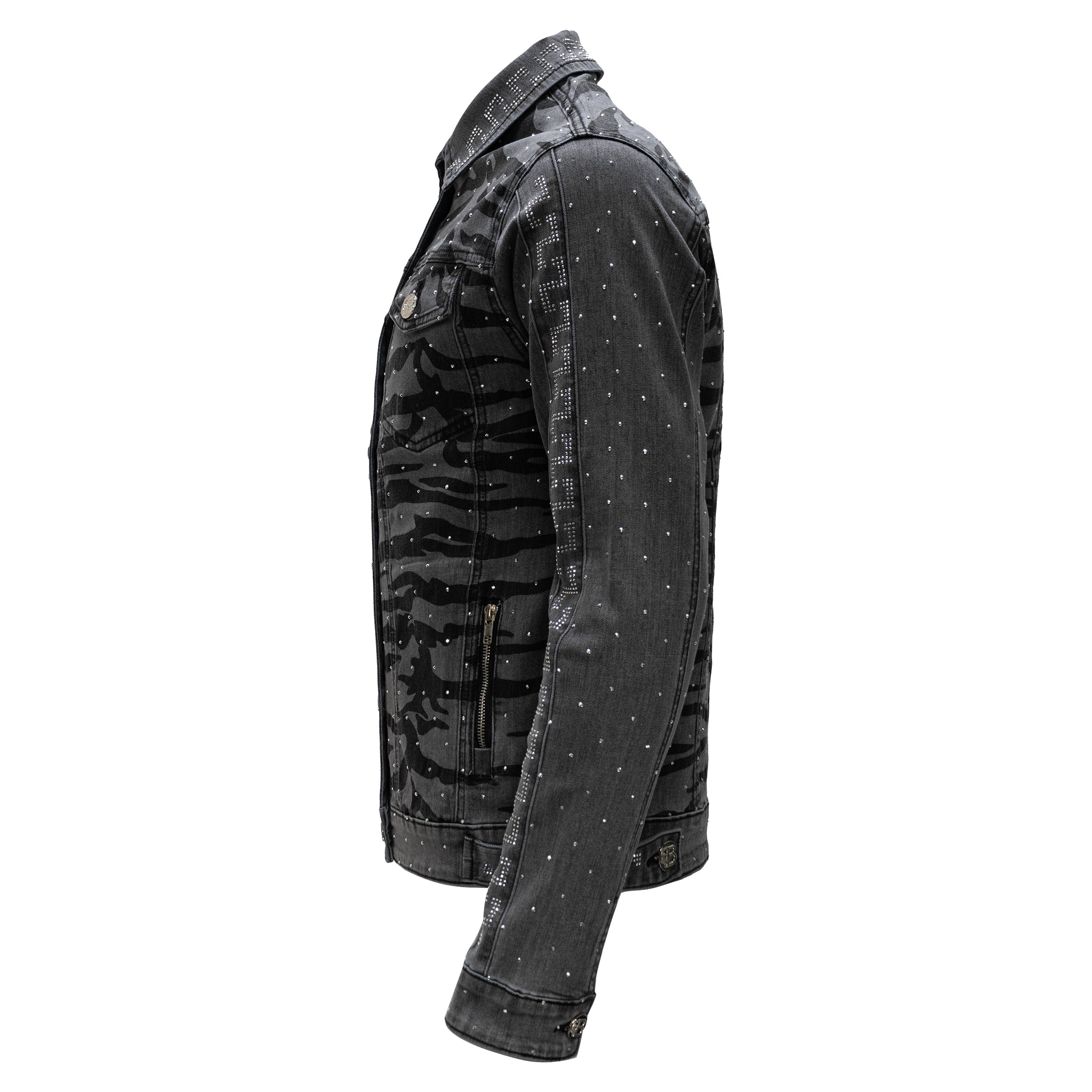 Unleash bold attitude with the Wild Luster denim jacket by Barocco—a fearless blend of urban camo and shimmering detail. Designed for those who command presence, this jacket features a tonal black camouflage print accented with an array of micro rhinestones that catch the light from every angle.