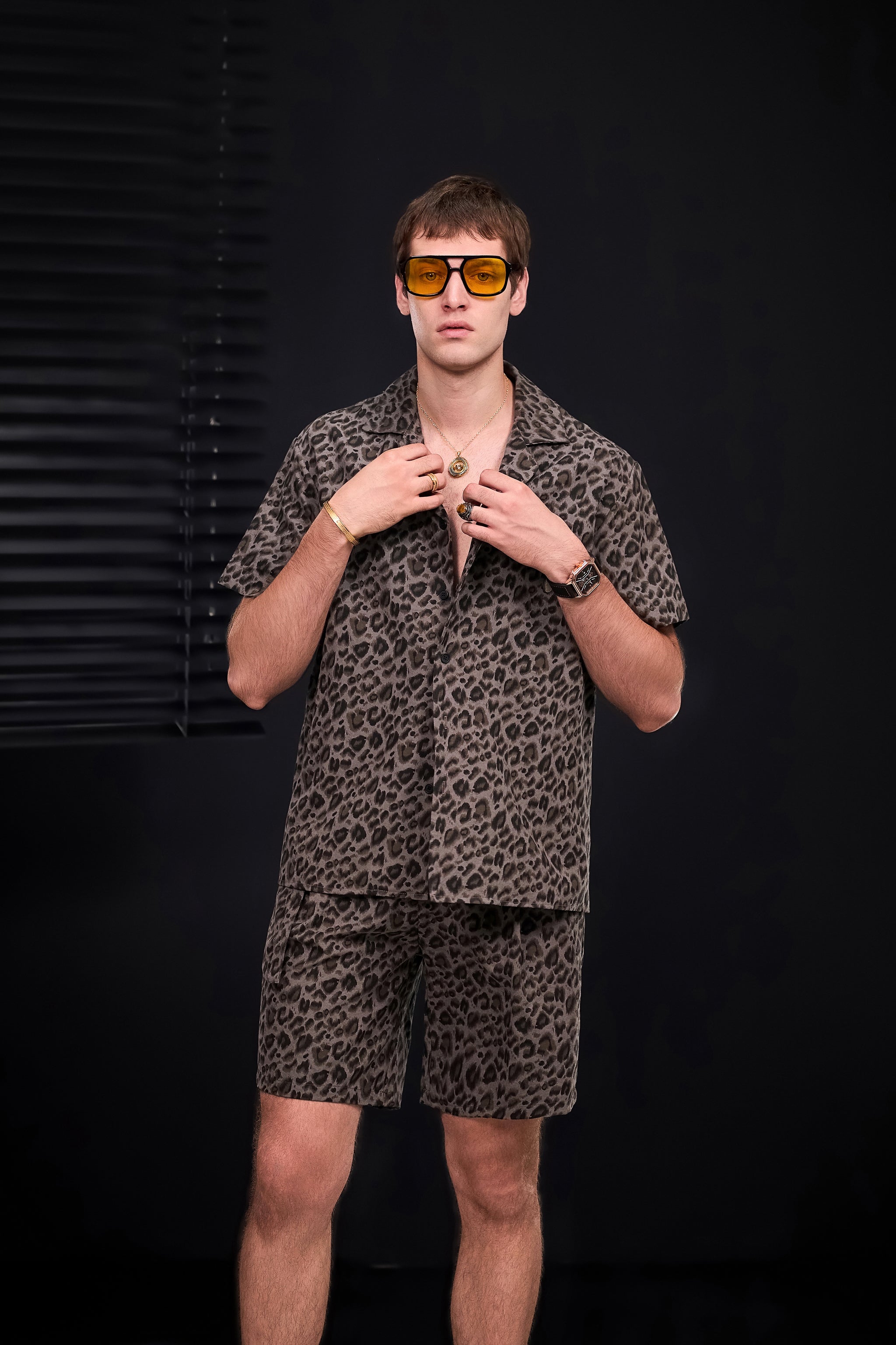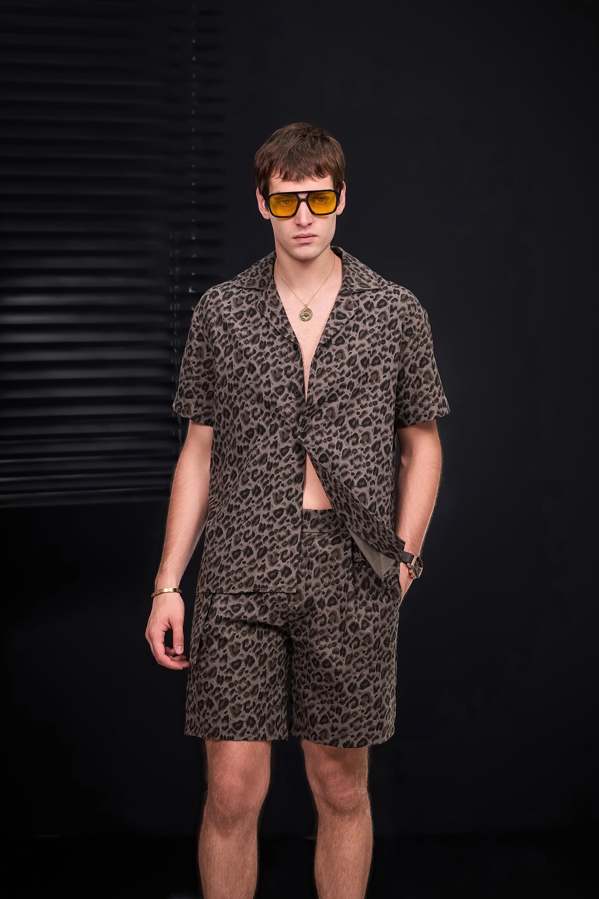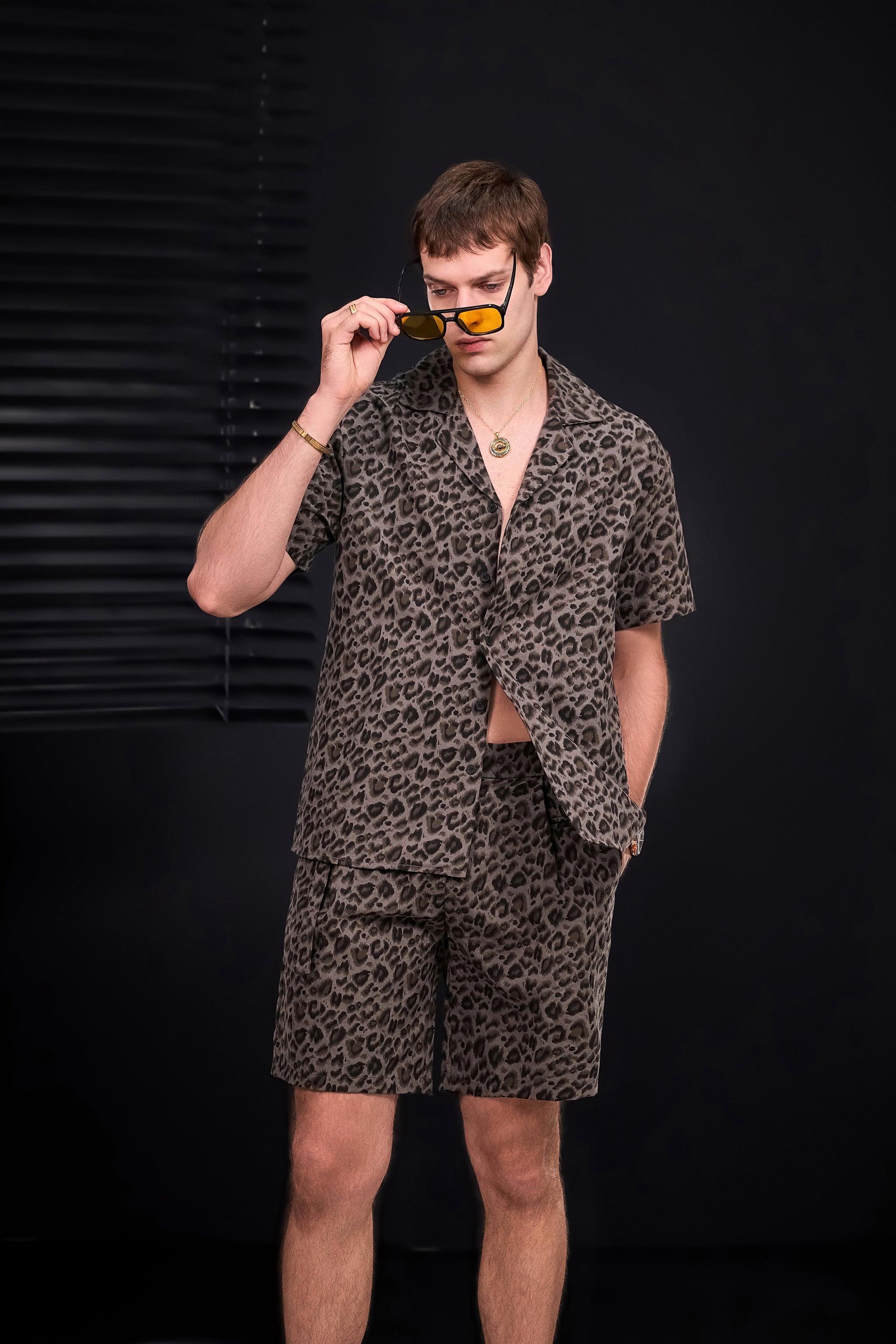 Understated elegance gets a bold twist in the Arden Camp Collar Shirt. Tailored in a relaxed silhouette with a soft spread collar, this short sleeve button-up features an allover leopard print rendered with subtle depth and refined confidence. Effortless, elevated, and just daring enough — it’s a statement of quiet luxury with an edge.