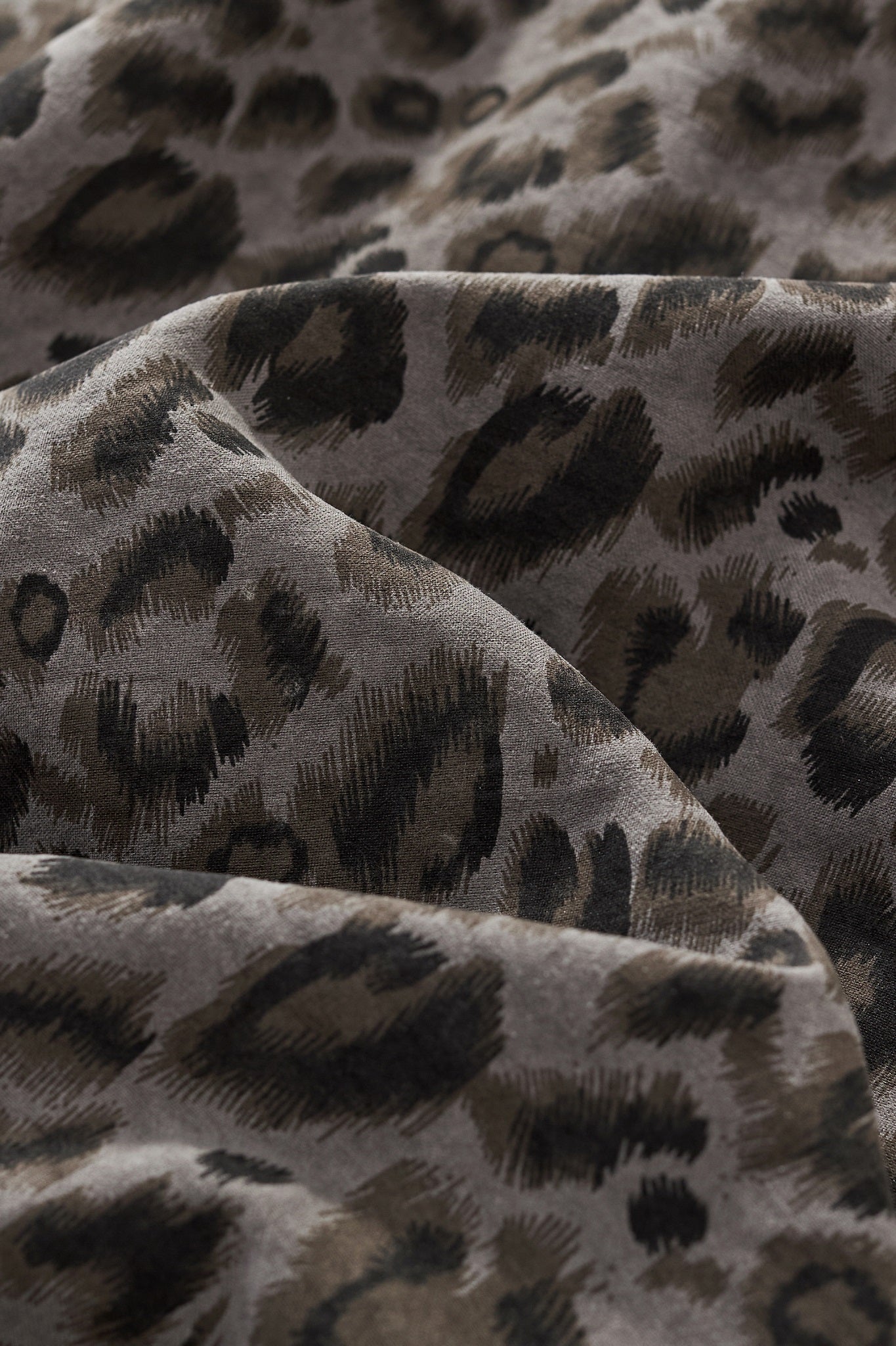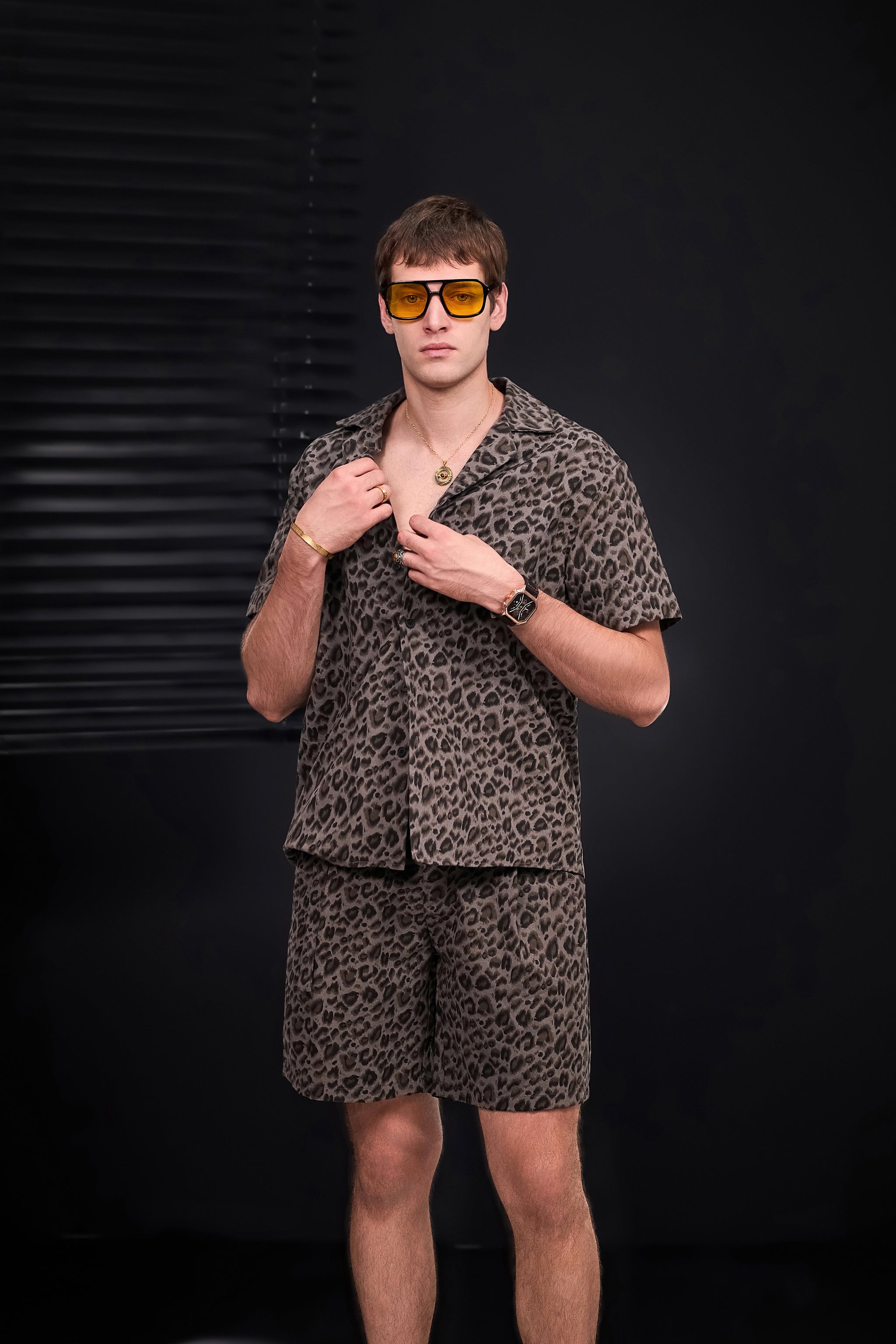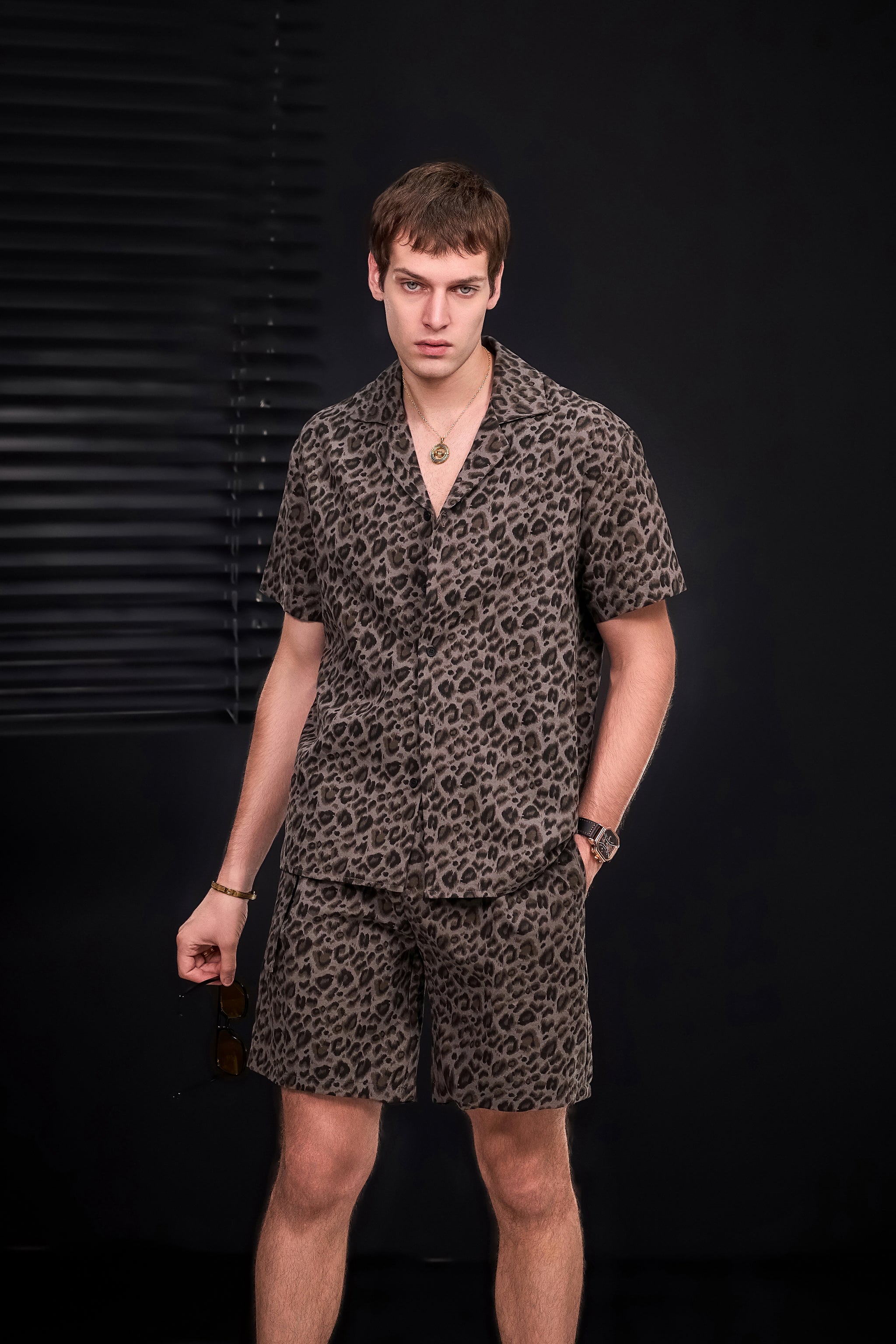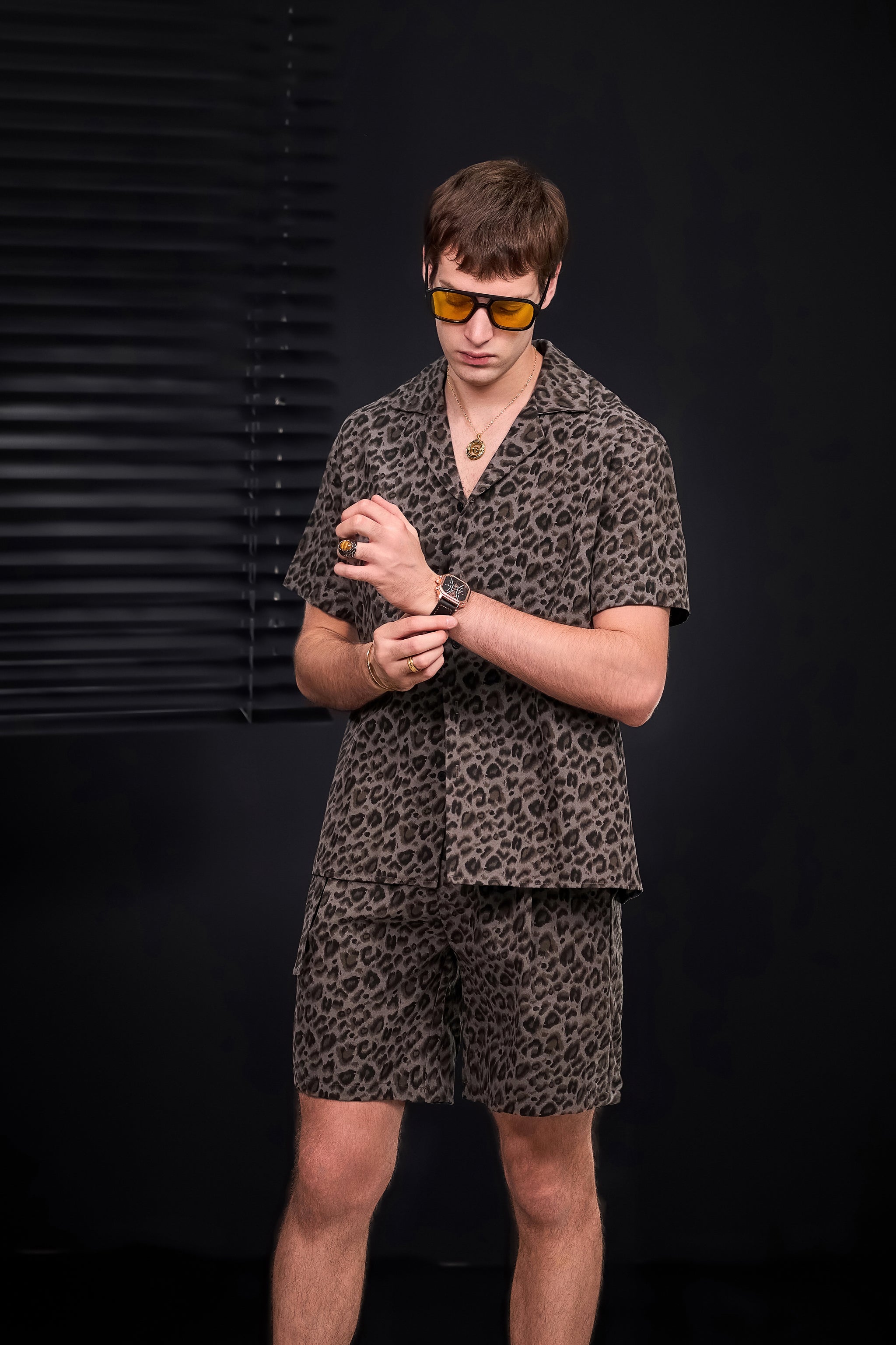 Understated elegance gets a bold twist in the Arden Camp Collar Shirt. Tailored in a relaxed silhouette with a soft spread collar, this short sleeve button-up features an allover leopard print rendered with subtle depth and refined confidence. Effortless, elevated, and just daring enough — it’s a statement of quiet luxury with an edge.