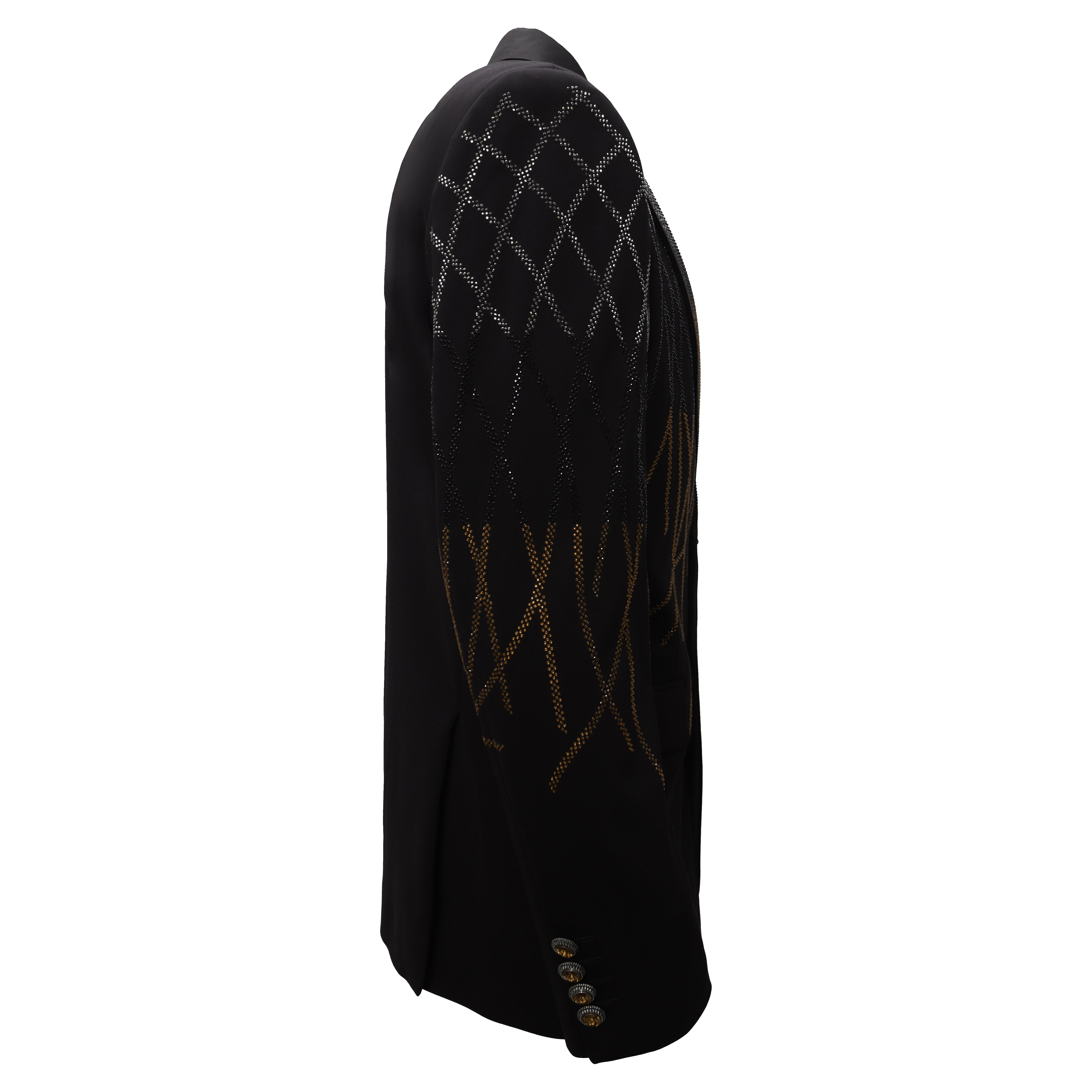 Step onto the runway or red carpet with the Bold Grace Blazer, a striking statement piece designed for bold singers, artists, and performers. Featuring an embellished peak lapel and intricate crystal-adorned line patterns, this blazer exudes confidence and luxury. Its premium stretch fabric ensures comfort and unrestricted movement, letting you command attention with every step. Perfect for performances, premieres, and any event where you want to shine with sophistication.