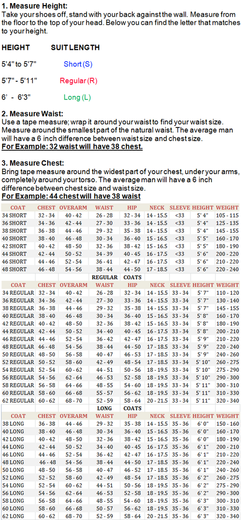 Shirts, Leather Jackets, Blazers and Pants Size Chart