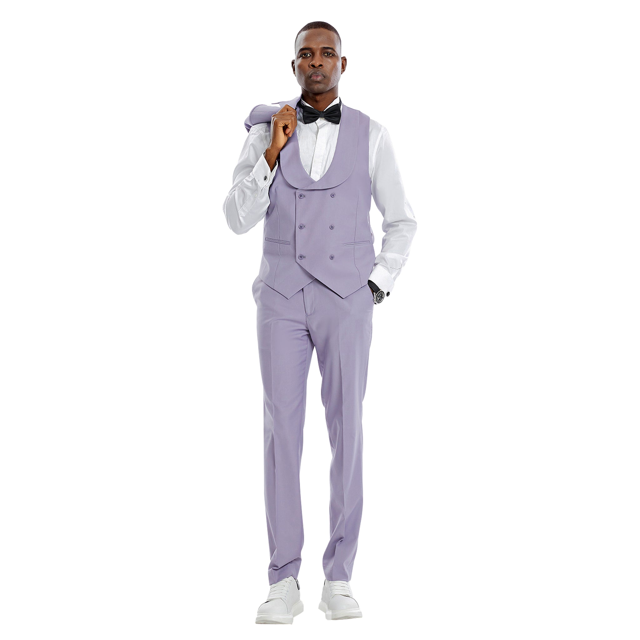 Lavender 3PC Peak Lapel Linen Double Breasted Vest Mens-suit