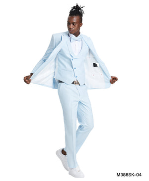 Sky Blue 3 PC Suit with U-Shaped Shawl Collared Vest