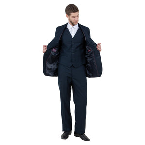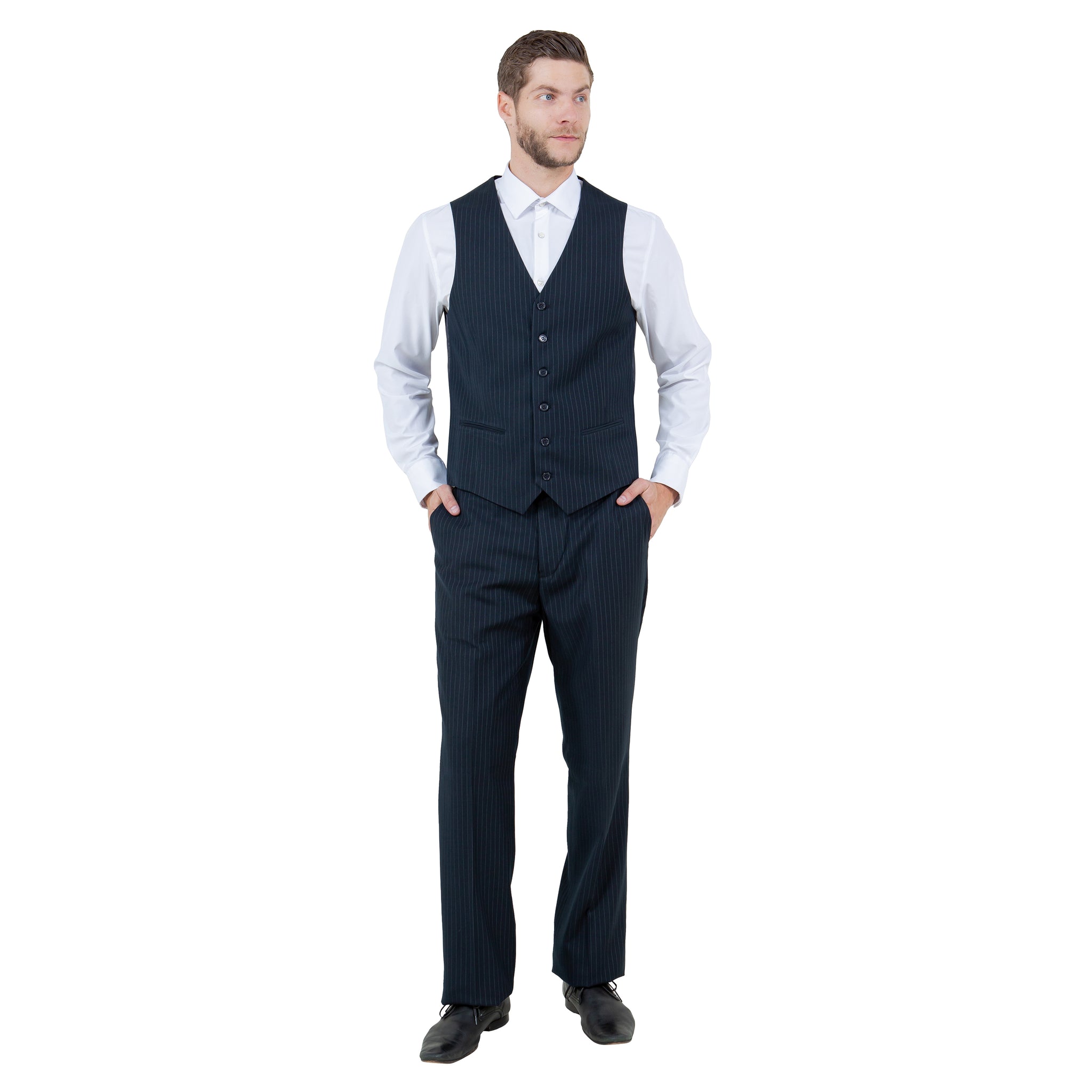 Step up your wardrobe with the Men's Modern-Fit 3pc Pinstripe Suit from Demantie. This stylish ensemble features a regular-fit jacket with a two-button front closure, classic notch lapel, and practical interior pockets, complete with underarm sweat guards for all-day comfort. The V-neck vest with a six-button closure and two slit pockets complements the jacket perfectly. The flat-front pants, lined to the knee with a 37-inch inseam, offer a modern silhouette, secured by a zip fly and extended button closure. Ideal for formal events or business meetings, this pinstripe suit ensures you look sharp and feel confident.