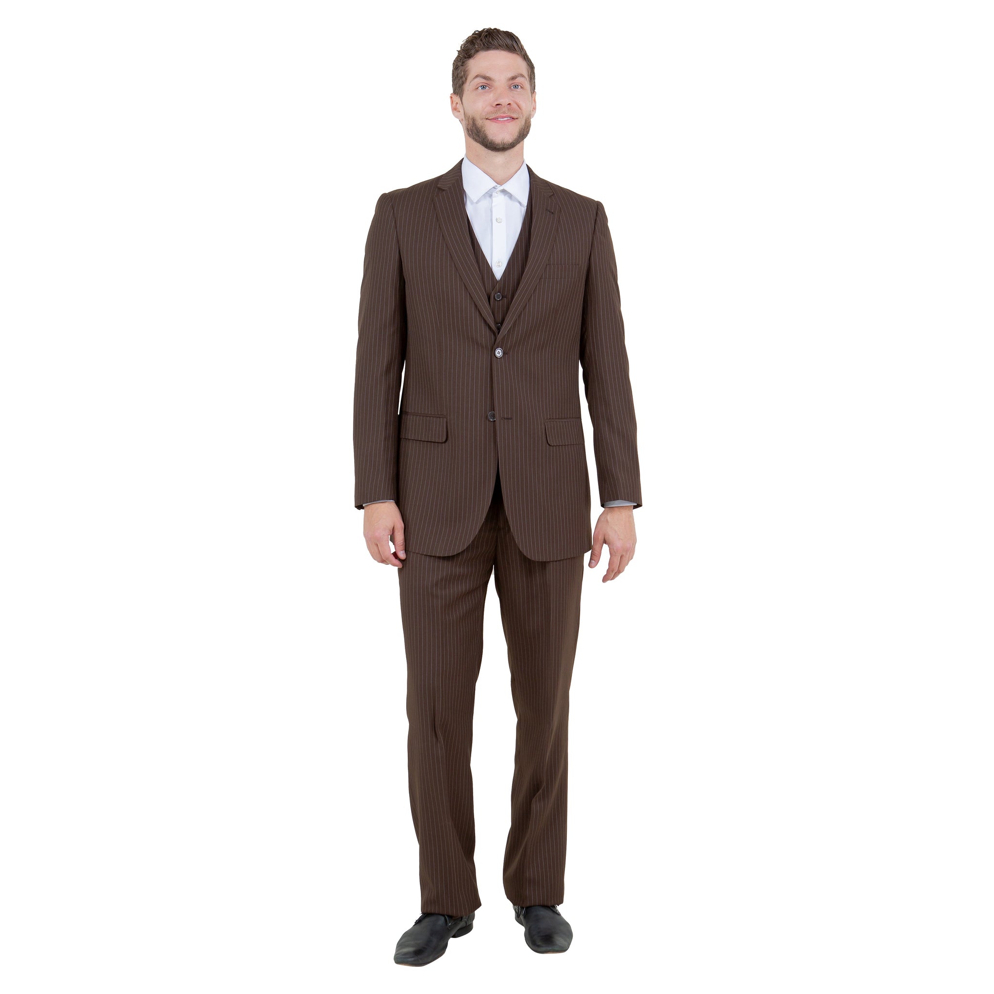 Step up your wardrobe with the Men's Modern-Fit 3pc Pinstripe Suit from Demantie. This stylish ensemble features a regular-fit jacket with a two-button front closure, classic notch lapel, and practical interior pockets, complete with underarm sweat guards for all-day comfort. The V-neck vest with a six-button closure and two slit pockets complements the jacket perfectly. The flat-front pants, lined to the knee with a 37-inch inseam, offer a modern silhouette, secured by a zip fly and extended button closure. Ideal for formal events or business meetings, this pinstripe suit ensures you look sharp and feel confident.