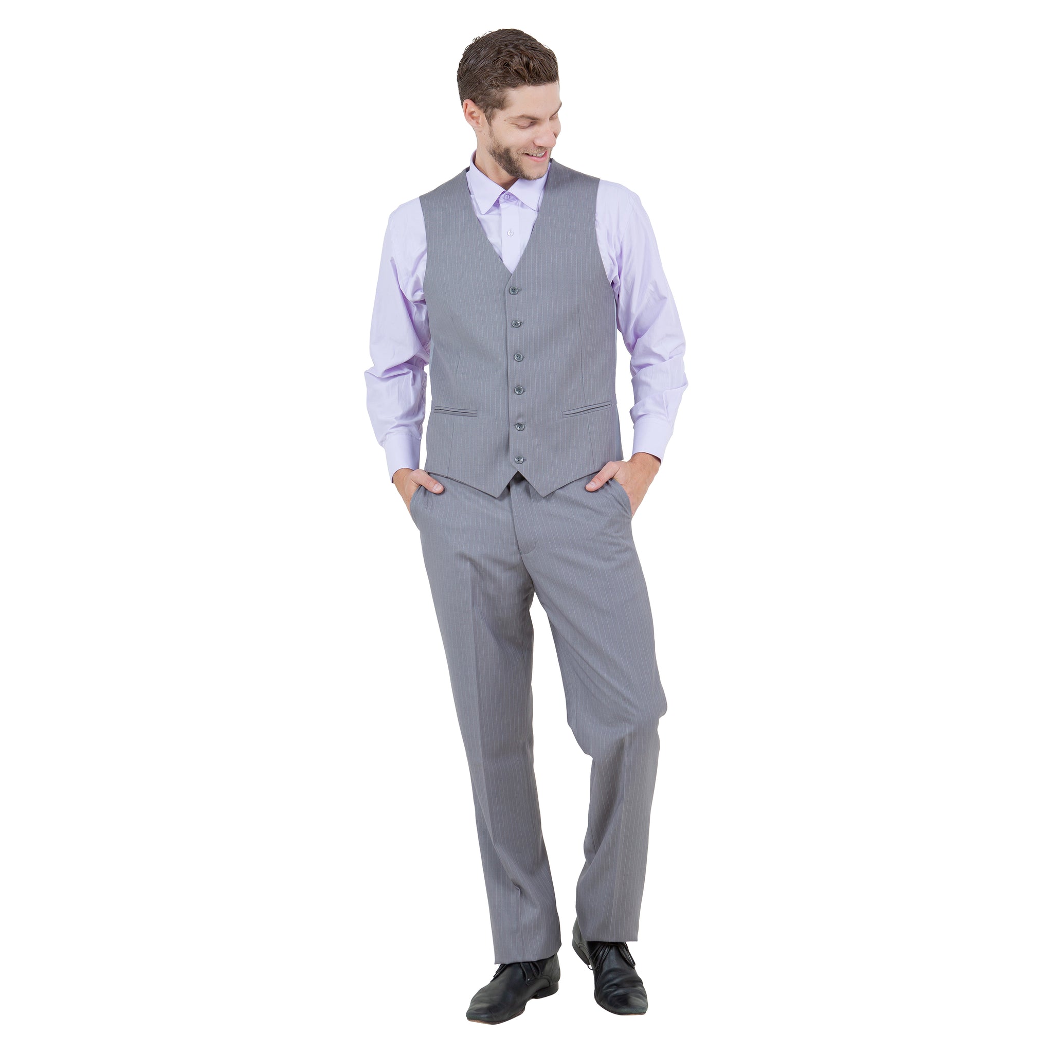 Step up your wardrobe with the Men's Modern-Fit 3pc Pinstripe Suit from Demantie. This stylish ensemble features a regular-fit jacket with a two-button front closure, classic notch lapel, and practical interior pockets, complete with underarm sweat guards for all-day comfort. The V-neck vest with a six-button closure and two slit pockets complements the jacket perfectly. The flat-front pants, lined to the knee with a 37-inch inseam, offer a modern silhouette, secured by a zip fly and extended button closure. Ideal for formal events or business meetings, this pinstripe suit ensures you look sharp and feel confident.