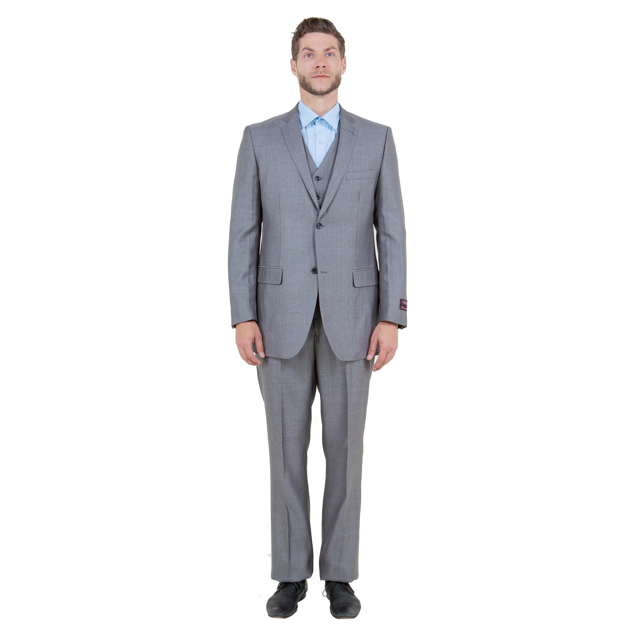 Make a statement with the Men's Modern-Fit 3pc Sharkskin Suit by Tazzio. This sophisticated ensemble features a textured solid jacket with a two-button front closure, notch lapel, and convenient side pockets, all tailored to a modern fit. The flat-front pants offer comfort and style with back besom pockets, front angled slip pockets, and lining to the knee, ensuring a perfect fit with a 37-inch inseam. The stylish vest completes the look with a V-neck and single-breasted six-button closure. Ideal for formal occasions and business events, this 3-piece suit, with its luxurious sharkskin fabric and matching jacket, waistcoat, and trousers, promises a sharp, elegant appearance that leaves a lasting impression.