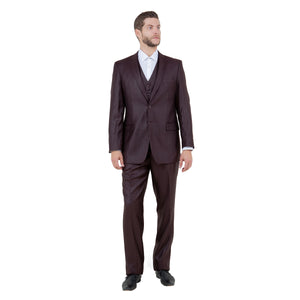 Make a statement with the Men's Modern-Fit 3pc Sharkskin Suit by Tazzio. This sophisticated ensemble features a textured solid jacket with a two-button front closure, notch lapel, and convenient side pockets, all tailored to a modern fit. The flat-front pants offer comfort and style with back besom pockets, front angled slip pockets, and lining to the knee, ensuring a perfect fit with a 37-inch inseam. The stylish vest completes the look with a V-neck and single-breasted six-button closure. Ideal for formal occasions and business events, this 3-piece suit, with its luxurious sharkskin fabric and matching jacket, waistcoat, and trousers, promises a sharp, elegant appearance that leaves a lasting impression.