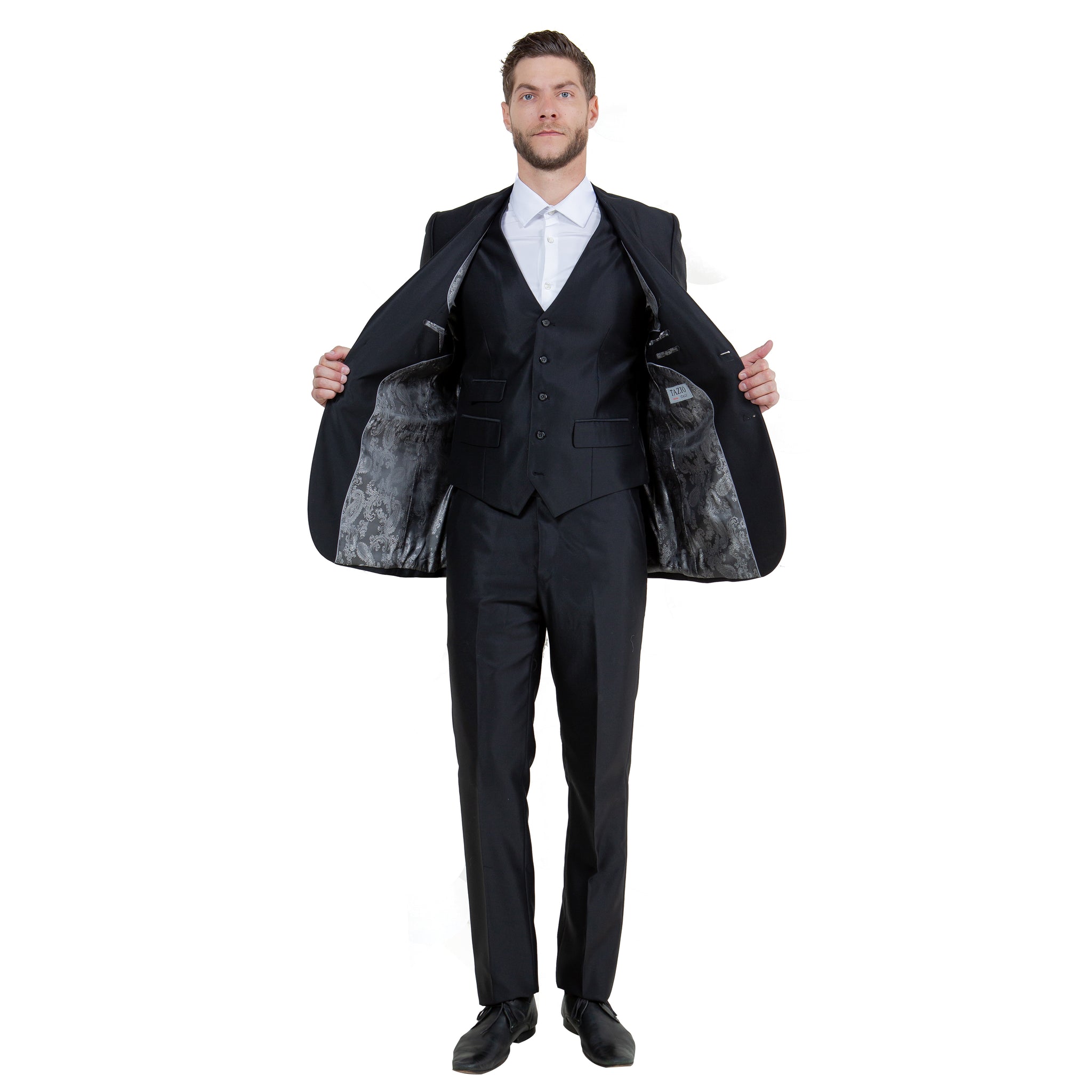 Elevate your formal attire with the Men's Tazio Slim-Fit 3pc Suit in Shiny Black. Crafted with precision by Tazio, this ensemble exudes sophistication and style. The Solid Sharkskin jacket features a Slim Fit, Two Button Front Closure, Notch Lapel, and convenient Side Vents, while the vest adds a polished touch with its Five Button closure and V Neck design. Completing the look, the coordinating Solid Sharkskin pants offer a sleek Flat Front design, 37 Inch Inseam, and practical features like back besom pockets with button closure and front angled slip pockets. Perfect for weddings, galas, or formal business events, this suit guarantees a timeless and elegant appearance with every wear.