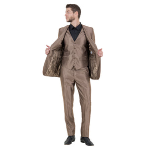 Elevate your formal attire with the Men's Tazio Slim-Fit 3pc Suit in Dark Taupe. Crafted with precision by Tazio, this ensemble exudes sophistication and style. The Solid Sharkskin jacket features a Slim Fit, Two Button Front Closure, Notch Lapel, and convenient Side Vents, while the vest adds a polished touch with its Five Button closure and V Neck design. Completing the look, the coordinating Solid Sharkskin pants offer a sleek Flat Front design, 37 Inch Inseam, and practical features like back besom pockets with button closure and front angled slip pockets. Perfect for weddings, galas, or formal business events, this suit guarantees a timeless and elegant appearance with every wear.