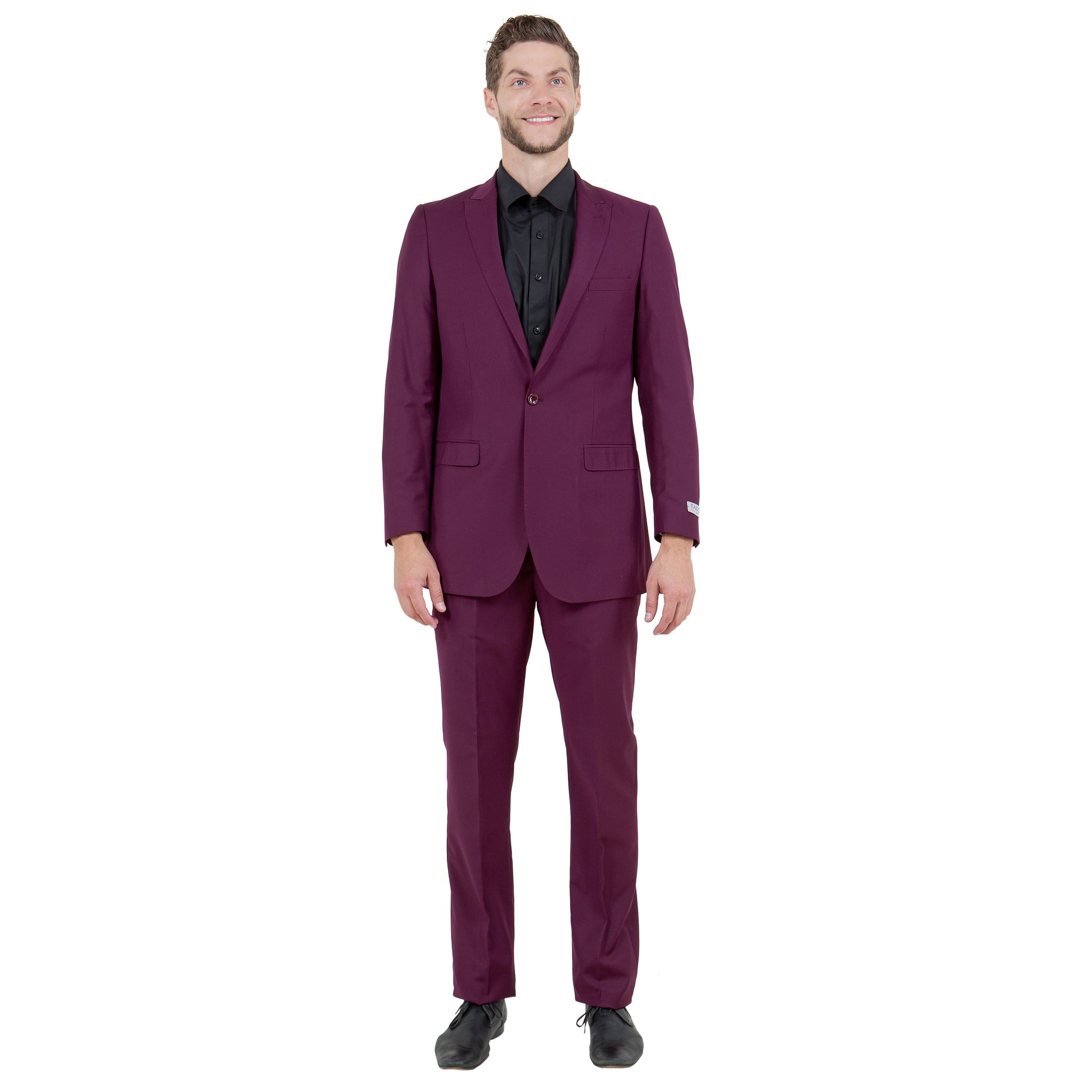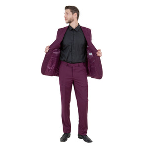 Introducing the Tazio Men's 2pc Suit Slim-Fit with Pick Stitch in rich burgundy, a symbol of refined sophistication and timeless style. Meticulously crafted, the jacket features a pick stitch on the lapel, slim notch lapel, and side vents ensuring mobility, while the interior boasts French facing and multiple pockets for practicality. The accompanying flat-front pants offer a tailored fit with back besom pockets and front slip pockets, all lined for comfort. Elevate your wardrobe with this versatile ensemble, seamlessly transitioning from day to night with enduring elegance and contemporary tailoring.