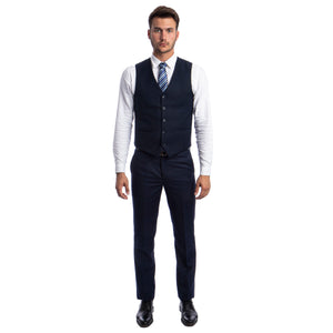 The Azzuro Men's Slim-Fit 3pc Suit in sophisticated navy. This versatile ensemble offers both style and sophistication. The jacket features a two-button front closure, slim notch lapel, and underarm sweat guards for comfort. With ample storage, including two besom front pockets and three interior pockets, functionality meets fashion. The accompanying vest adds elegance with its five-button closure and slit pockets. The flat-front pants, lined to the knee, provide a tailored fit with convenience in mind. Crafted from 100% polyester, this suit combines durability with timeless appeal. Elevate your wardrobe effortlessly with the Azzuro Men's Slim-Fit 3pc Suit.