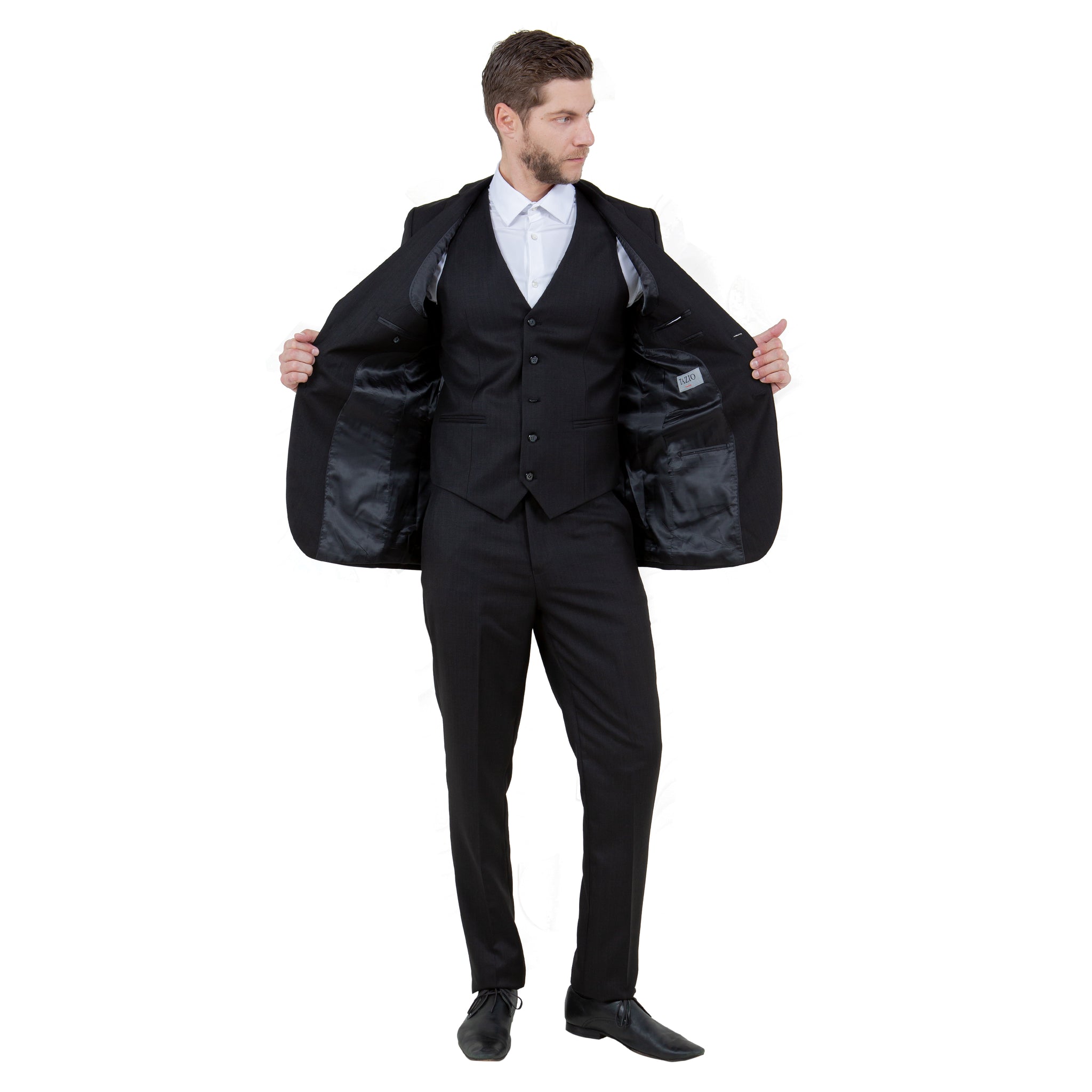 Enhance your collection with the Tazio Men's Slim-Fit 3-Piece Sharkskin Suit in Black, embodying sophistication and contemporary style. This meticulously crafted ensemble features a solid jacket with a two-button front closure and slim notch lapel for a modern silhouette, alongside functional elements like side vents and underarm sweat guards. The accompanying vest adds an extra layer of refinement with its V-neck design and 5-button closure, while the flat-front pants offer both style and convenience with their lined construction and multiple pockets. Perfect for formal occasions or professional settings, this suit exudes confidence and elegance, making it a timeless addition to any gentleman's collection.