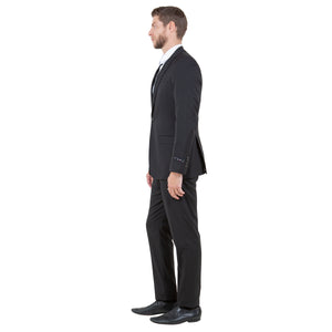 Introducing the Tazzio Men's Ultra Slim-Fit 3pc Suit with Expandable Waistband in Classic Black���a pinnacle of sophistication and practicality. The jacket boasts a slim notch lapel, two-button closure, and underarm sweat guards for comfort, alongside interior pockets for convenience. The V-neck vest complements with a five-button closure and two slit pockets, while the flat front pants feature an expandable waistband, ample storage, and a zip fly for ease. Perfect for any occasion, this ensemble effortlessly combines style and functionality for the modern gentleman.