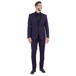 Introducing the Tazzio Men's Ultra Slim-Fit 3pc Suit with Expandable Waistband in Purple���an epitome of sophistication and practicality. The jacket boasts a slim notch lapel, two-button closure, and underarm sweat guards for comfort, alongside interior pockets for convenience. The V-neck vest complements with a five-button closure and two slit pockets, while the flat front pants feature an expandable waistband, ample storage, and a zip fly for ease. Perfect for any occasion, this ensemble effortlessly combines style and functionality for the modern gentleman.