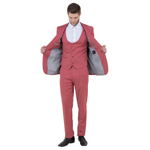 Introducing the Tazzio Men's Ultra Slim-Fit 3pc Suit with Expandable Waistband in Coral���a fusion of sophistication and practicality. The jacket features a slim notch lapel, two-button closure, and underarm sweat guards for comfort, alongside interior pockets for convenience. Complementing the ensemble, the V-neck vest boasts a five-button closure and two slit pockets, while the flat front pants offer an expandable waistband, ample storage, and a zip fly for ease. Whether for work or special occasions, this ensemble effortlessly marries style and functionality for the modern gentleman.