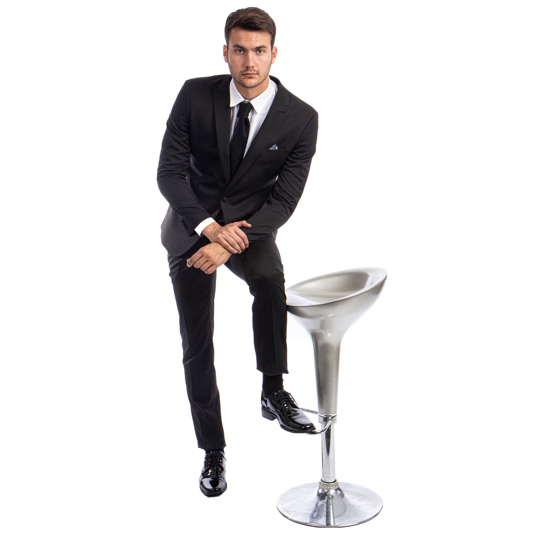Introducing the Tazio Men's Skinny-Fit 2pc Suit with Peak Lapel in classic black: a sophisticated ensemble designed for the modern gentleman. With a sleek silhouette, the jacket features a solid design, two-button front closure, and peak lapel, while the pants boast a tailored fit with flat front and extended button closure. Practicality meets style with ample storage options, underarm sweat guards, and a skinny-fitted design that enhances confidence and charm. Perfect for formal events or special occasions, this suit exudes timeless elegance and ensures a lasting impression wherever you go.