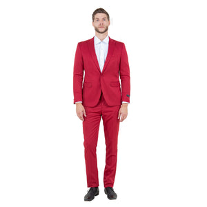 Introducing the Tazio Men's Skinny-Fit 2pc Suit with Peak Lapel in bold red: a sophisticated ensemble designed for the modern gentleman. With a sleek silhouette, the jacket features a solid design, two-button front closure, and peak lapel, while the pants boast a tailored fit with flat front and extended button closure. Practicality meets style with ample storage options, underarm sweat guards, and a skinny-fitted design that enhances confidence and charm. Perfect for formal events or special occasions, this suit exudes timeless elegance and ensures a lasting impression wherever you go.