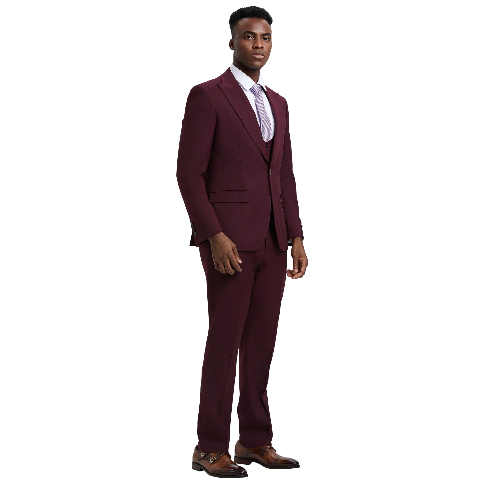 Experience timeless sophistication with the Stacy Adams Hybrid-Fit 3pc Suit Set in elegant burgundy, meticulously crafted for the modern gentleman. The solid burgundy jacket boasts a two-button front closure, peak lapel, and underarm sweat guards, ensuring both style and comfort. Complementing the ensemble, the burgundy U-shaped vest features a four-button closure for added refinement. The flat-front burgundy pants, complete with an expandable waistband and functional pockets, offer unparalleled versatility. Available in slim-fit sizes 36-44 and modern-fit sizes 46-62, this burgundy suit set caters to diverse preferences, promising a tailored look for every occasion. Unleash your confidence and sophistication with the Stacy Adams Hybrid-Fit 3pc Suit Set in burgundy.