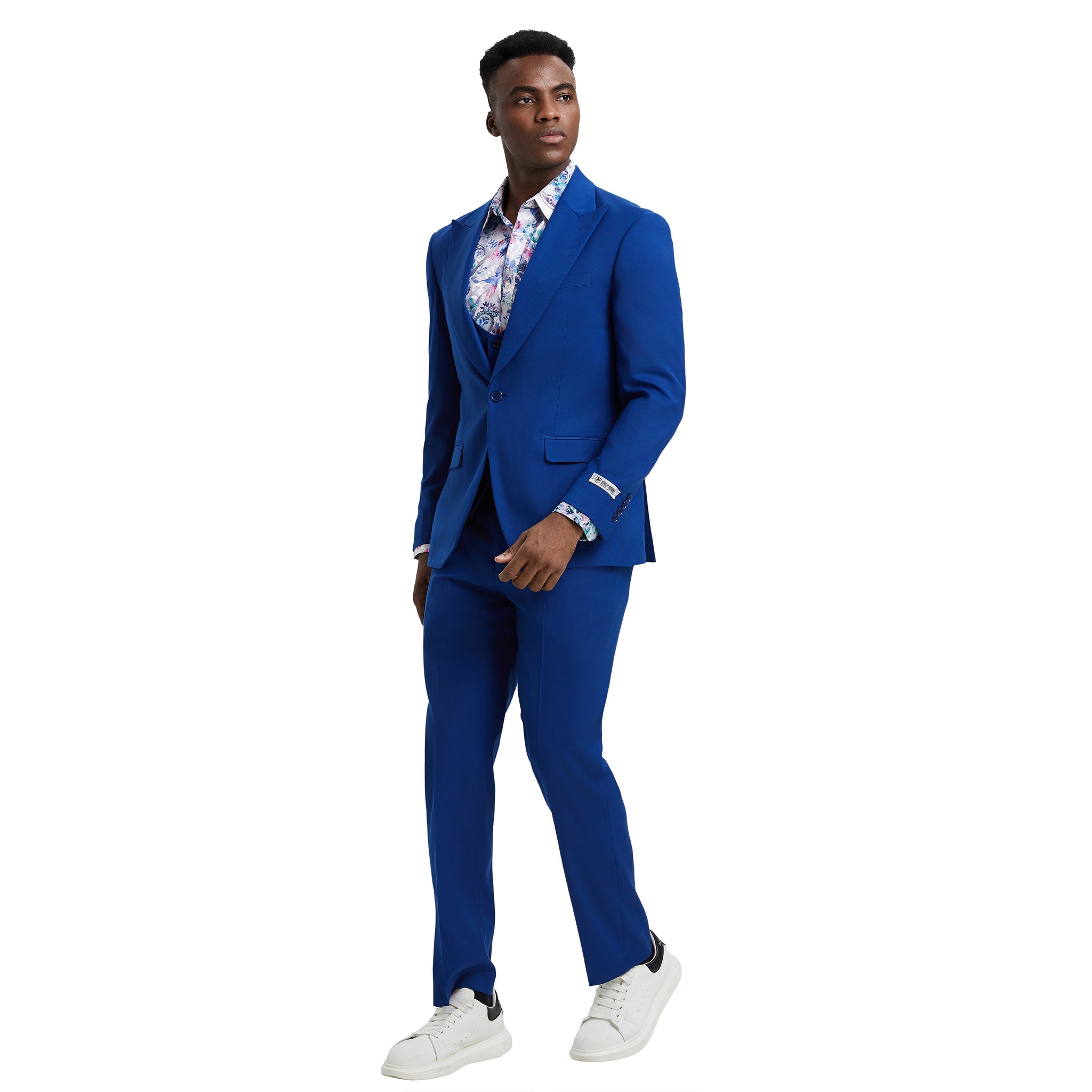 Experience timeless sophistication with the Stacy Adams Hybrid-Fit 3pc Suit Set in deep indigo, meticulously crafted for the modern gentleman. The solid indigo jacket boasts a two-button front closure, peak lapel, and underarm sweat guards, ensuring both style and comfort. Complementing the ensemble, the indigo U-shaped vest features a four-button closure for added refinement. The flat-front indigo pants, complete with an expandable waistband and functional pockets, offer unparalleled versatility. Available in slim-fit sizes 36-44 and modern-fit sizes 46-62, this indigo suit set caters to diverse preferences, promising a tailored look for every occasion. Unleash your confidence and sophistication with the Stacy Adams Hybrid-Fit 3pc Suit Set in indigo.