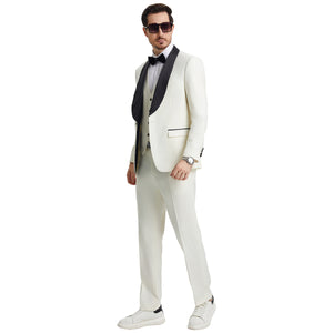 Elevate your formal attire with the Men's Stacy Adams Hybrid-Fit 3pc Tuxedo Set. This sophisticated ensemble combines traditional elegance with modern design elements. The jacket features a satin shawl collar, a sleek one-button front closure, and a hybrid fit for contemporary comfort. Inside, it boasts French facing, three interior pockets, and underarm sweat guards for a touch of luxury. The V-neck vest with a four-button closure complements the jacket, providing a polished layer with side slit pockets for added convenience. Completing the set are flat-front pants with two back besom pockets and two front angled slip pockets for a sharp, tailoIvory look. Ideal for weddings, galas, or any formal occasion, this tuxedo set ensures you'll make a lasting impression with style and confidence.