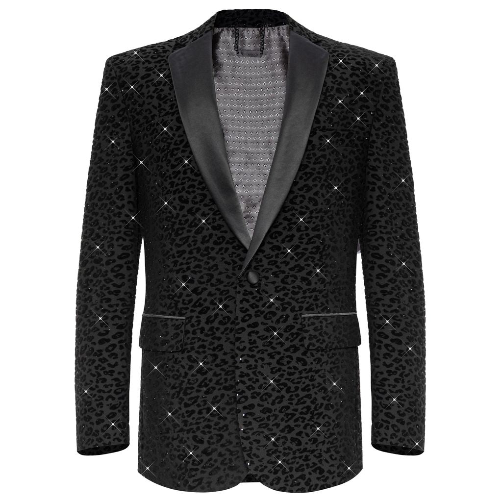 Turn every entrance into a statement with the Redefined Radiance Blazer, a bold fusion of luxury and modern edge. Crafted from premium black cheetah-print fabric and embellished with sparkling rhinestones, this blazer exudes confidence and star power. The sleek notch lapel and single-button closure create a sharp silhouette perfect for special events, performances, or elevated eveningwear.